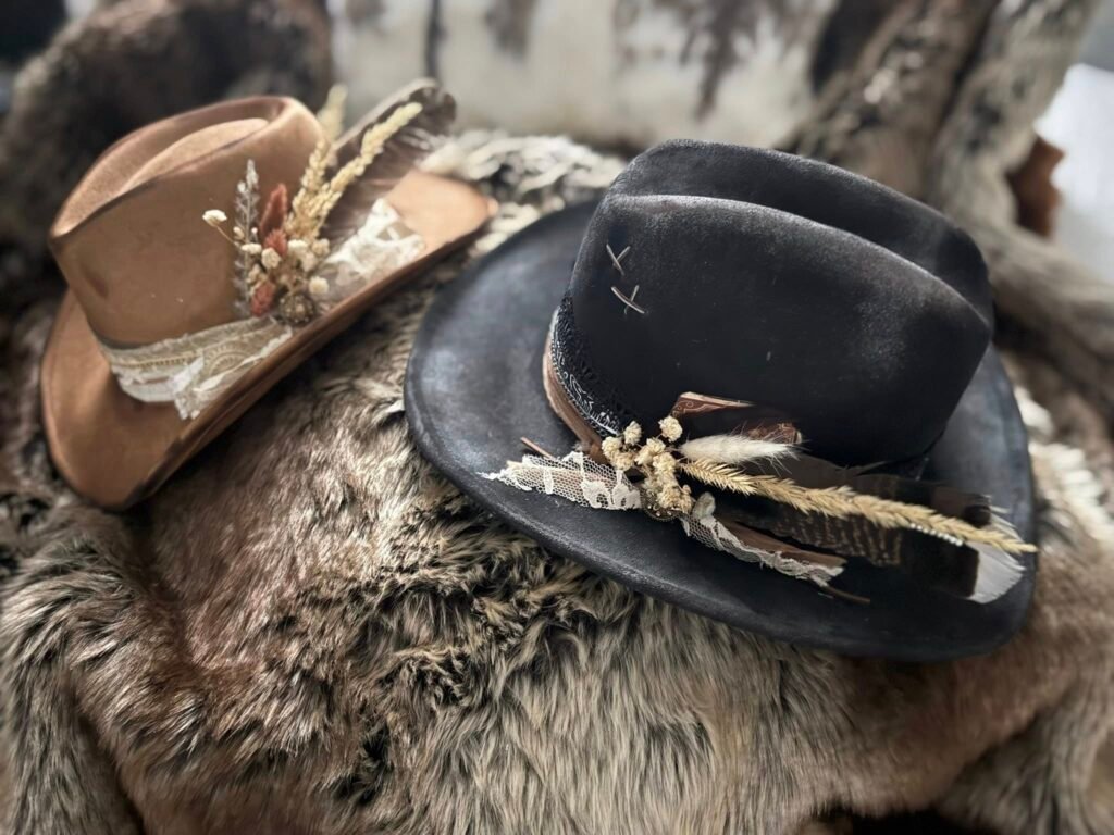Customize your hat with layered fabric or leather bands, feathers, dried flowers, stitched details, rhinestones, chains, leather or twine wraps, matchsticks – you name it. You can also add custom stitching to the crown or brim edge.